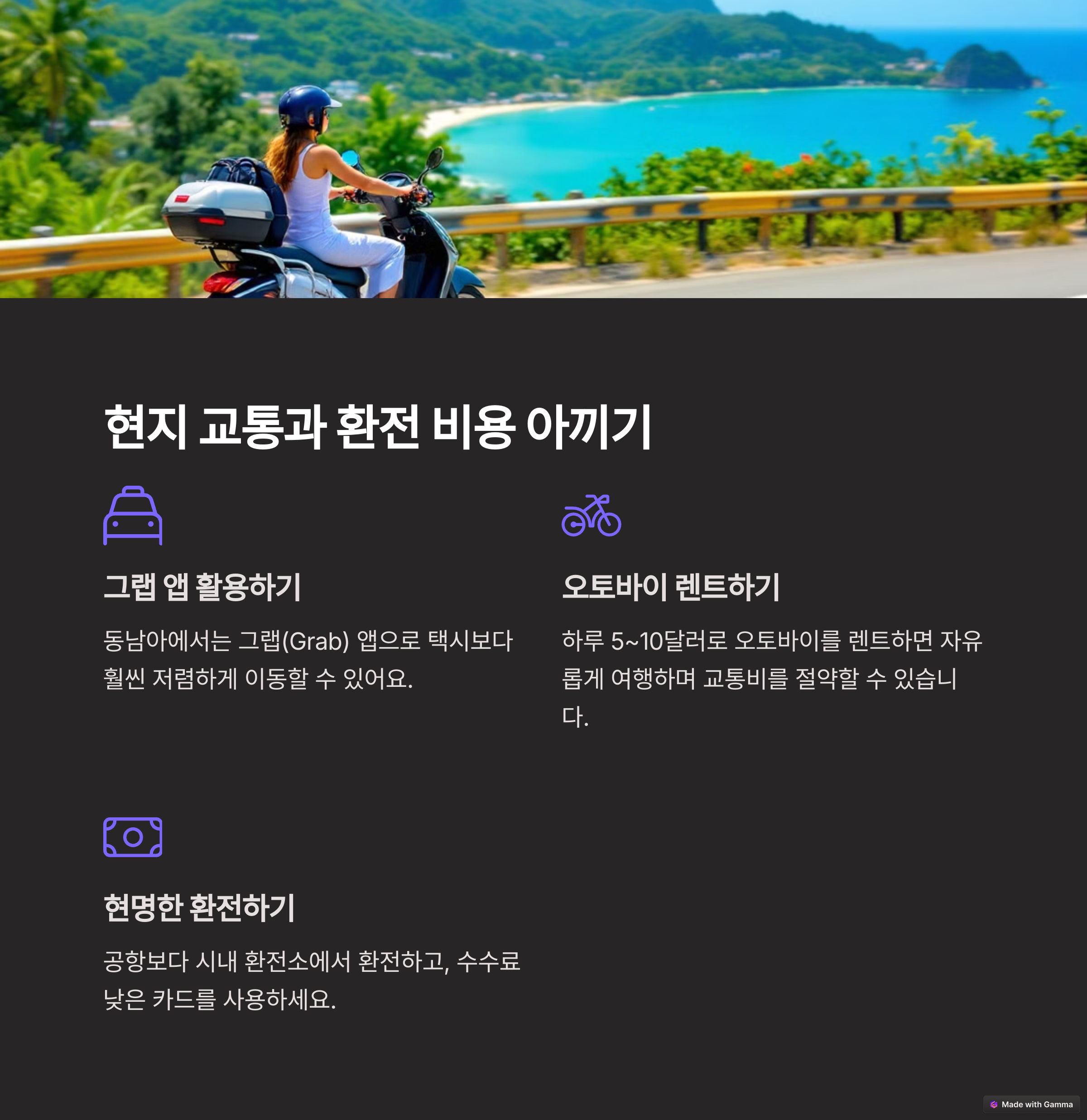 현지 교통비도 여행 경비 절약의 중요한 요소입니다. 택시보다는 대중교통을 적극 활용하는 것이 좋으며, 동남아 주요 도시에서는 그랩(Grab) 앱을 이용하면 저렴하고 안전하게 이동할 수 있습니다. 또한, 렌터카 대신 오토바이 렌트를 고려하면 훨씬 저렴한 비용으로 여행을 다닐 수 있습니다. 단, 안전 장비 착용과 국제운전면허 필요 여부 등 현지 교통 법규를 반드시 확인하세요.