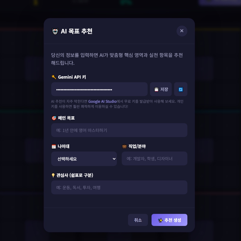 이게 바로 핵심 기능입니다! 메인 목표 하나만 입력하고 'AI 추천' 버튼을 누르면, 81개의 칸이 마법처럼 구체적인 실천 과제들로 채워집니다.