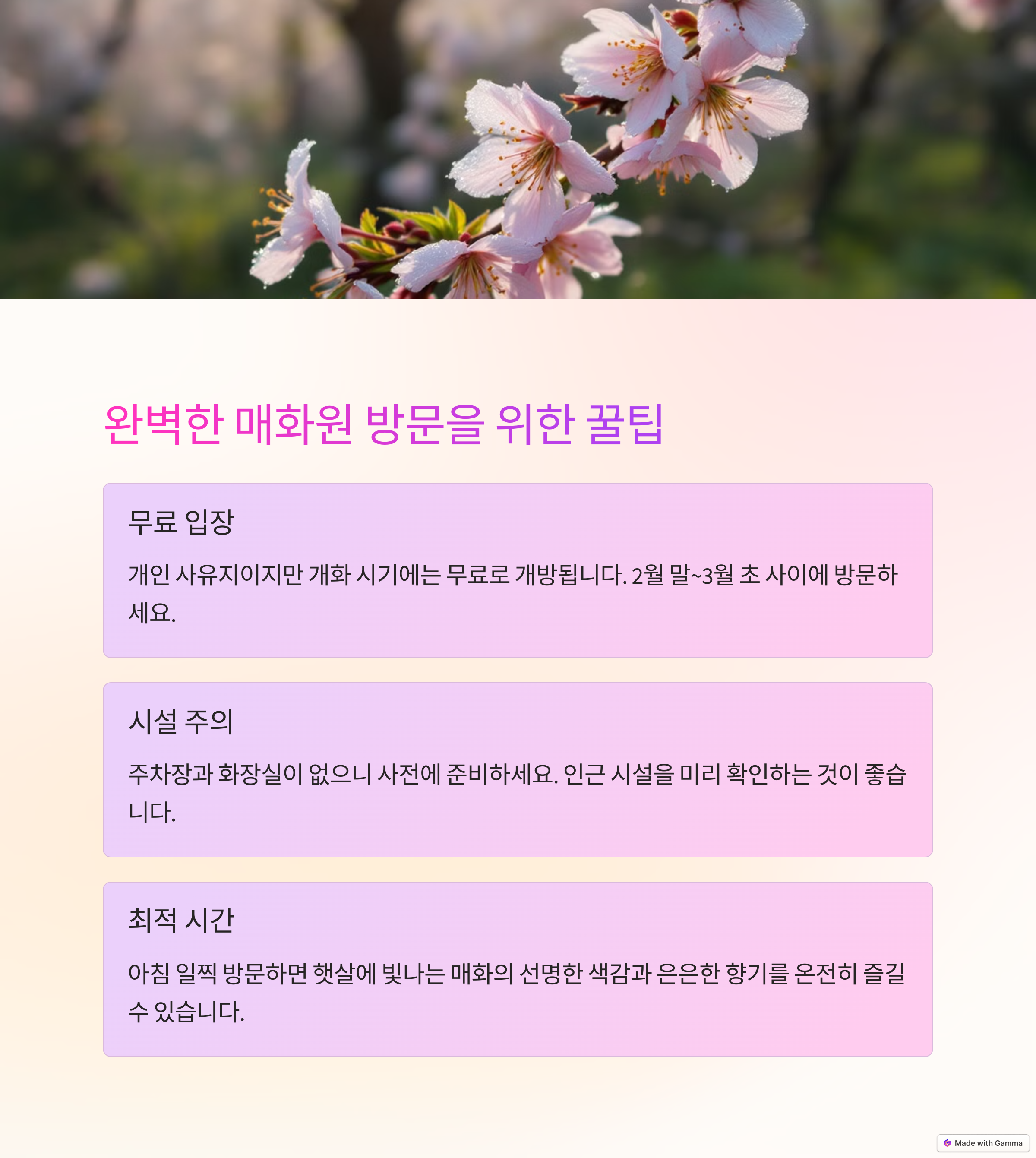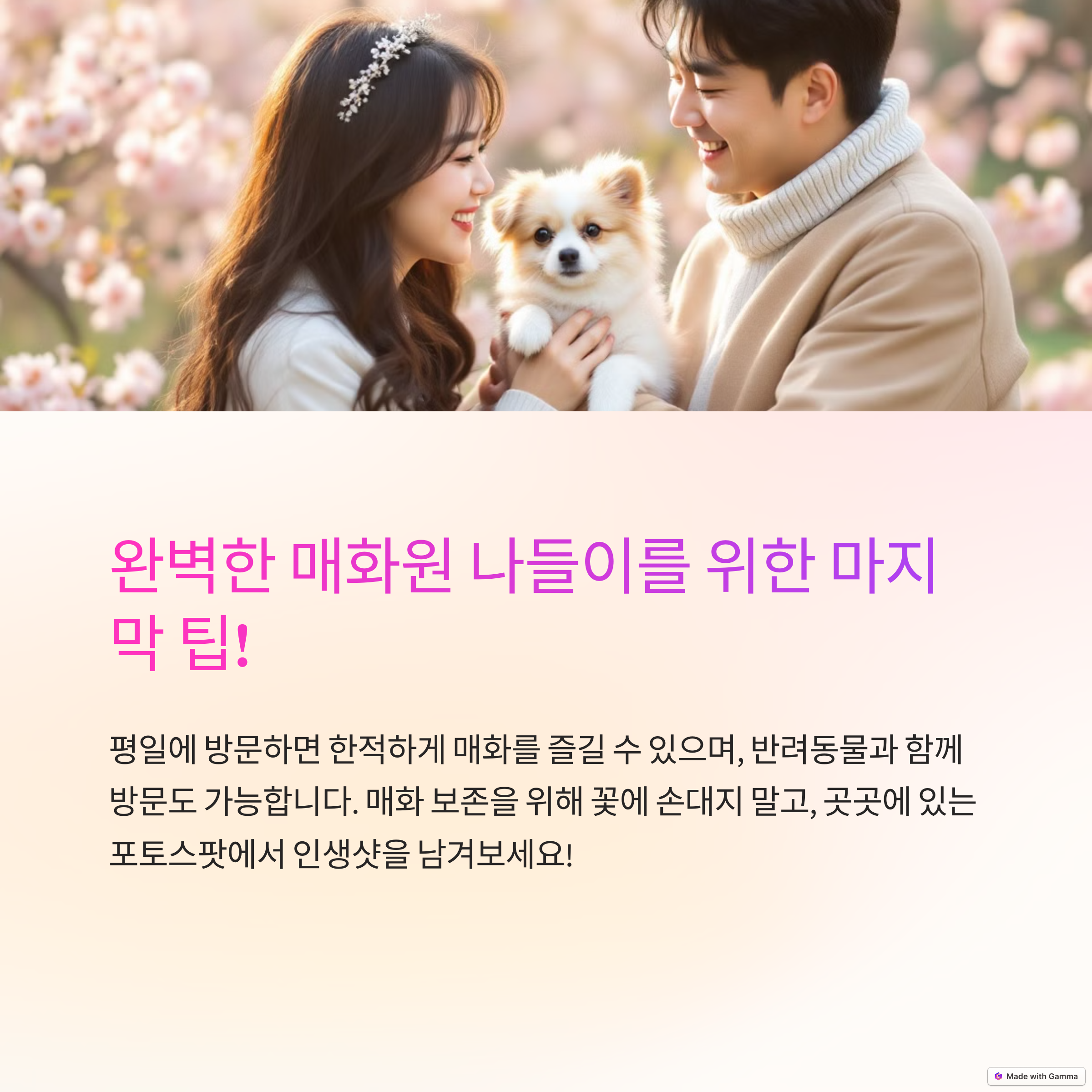 기장매화원을 더욱 알차게 즐기기 위해 몇 가지 팁을 준비했습니다. 아래의 팁을 참고하시면 더욱 쾌적하고 즐거운 여행이 될 거예요.