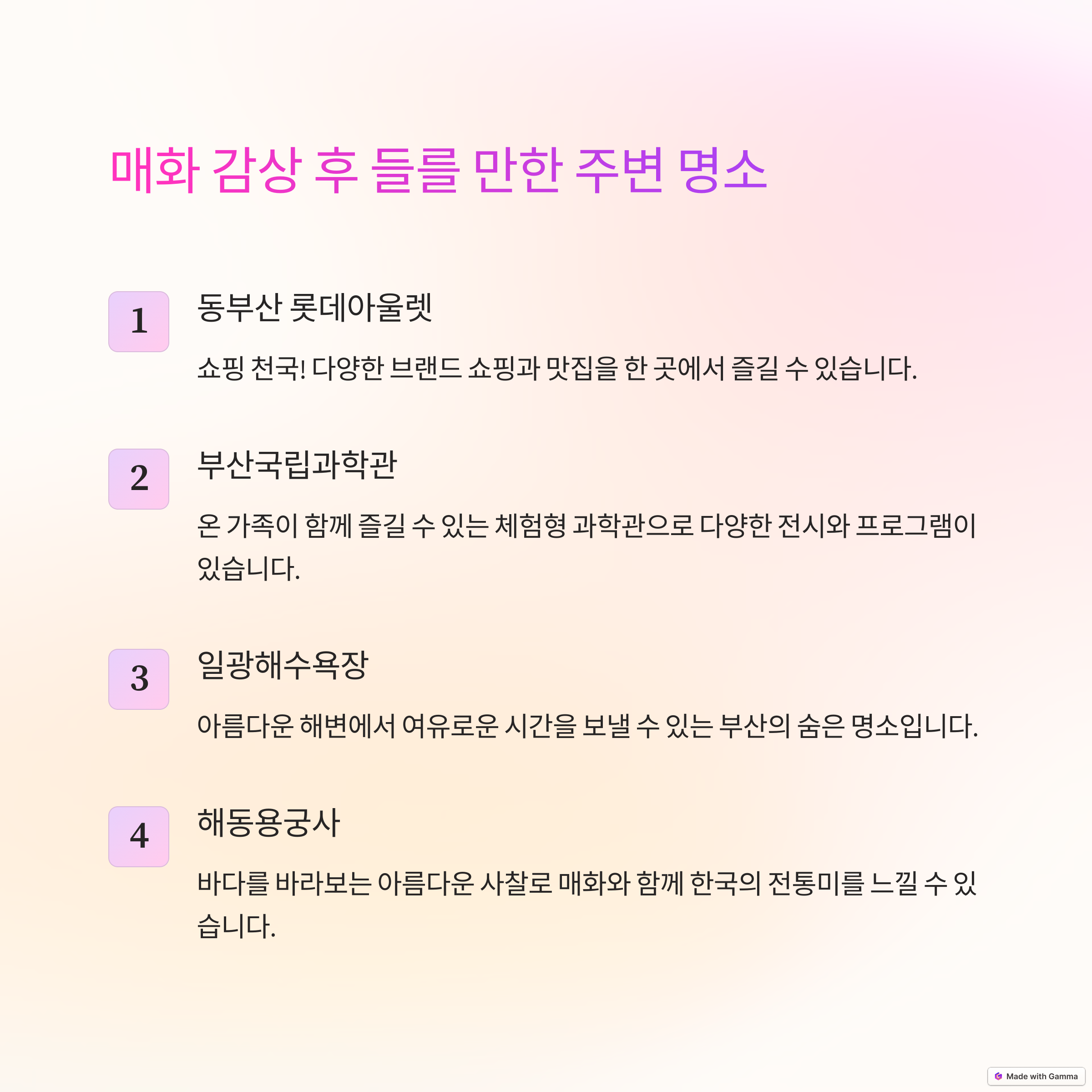 기장매화원을 방문한 후에는 주변 관광지를 함께 둘러보는 것도 좋은 선택입니다. 기장에는 아름다운 해안 풍경과 다양한 볼거리가 많아 가족 나들이나 데이트 코스로 적합합니다.
