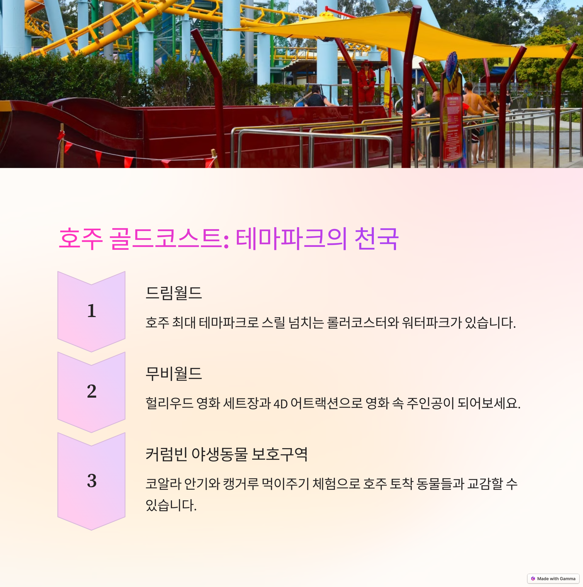 골드코스트는 멋진 해변과 다양한 테마파크로 유명한 곳이에요. 아이들과 함께 방문하기 좋은 테마파크가 많아서 가족 단위 여행객들에게 강력 추천하는 곳이죠.
