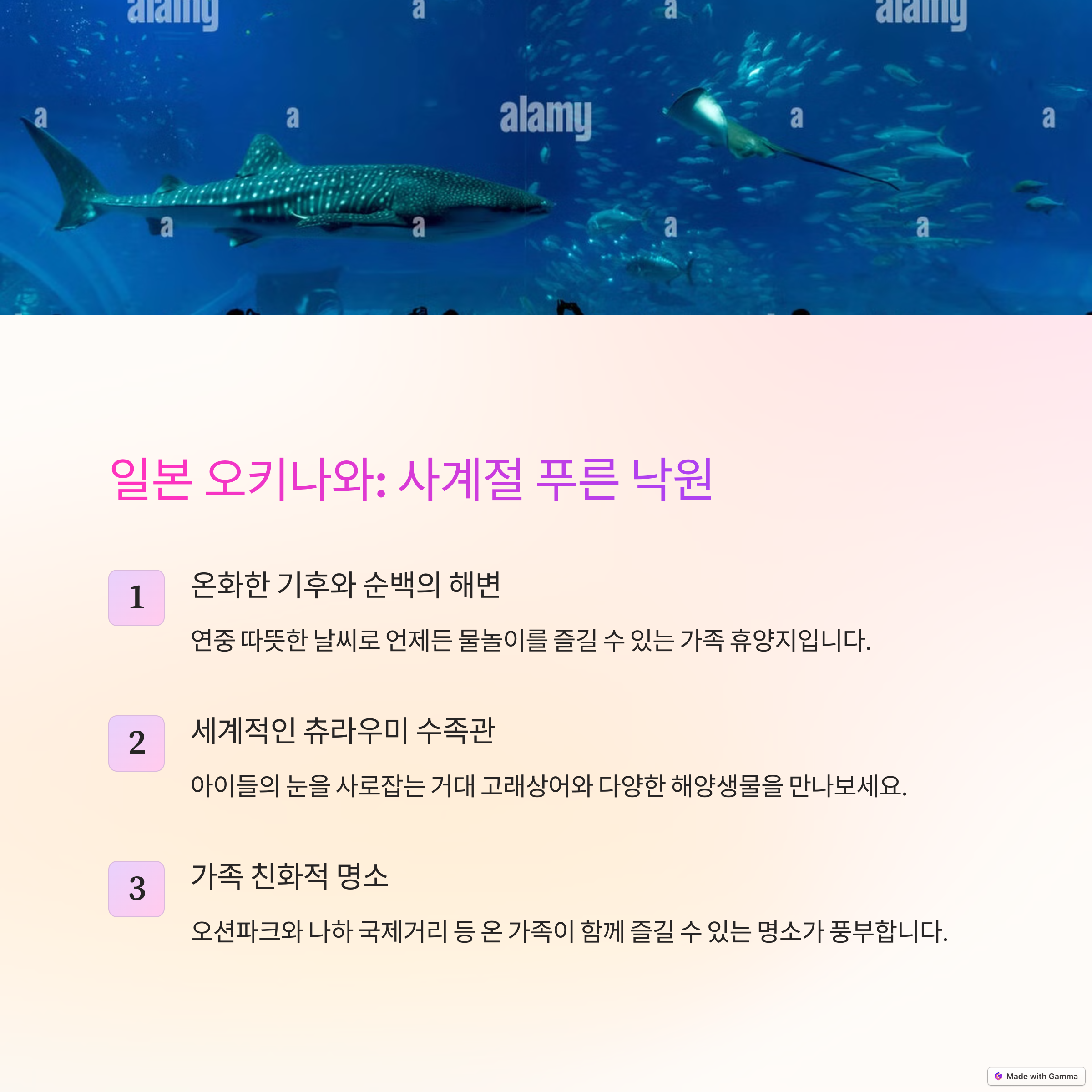 오키나와는 ‘동양의 하와이’라고 불릴 만큼 아름다운 해변과 온화한 기후를 자랑하는 곳이에요. 일본 본토보다 따뜻한 날씨 덕분에 1년 내내 해양 스포츠를 즐길 수 있으며, 가족 여행객들에게도 최고의 여행지로 손꼽힙니다.