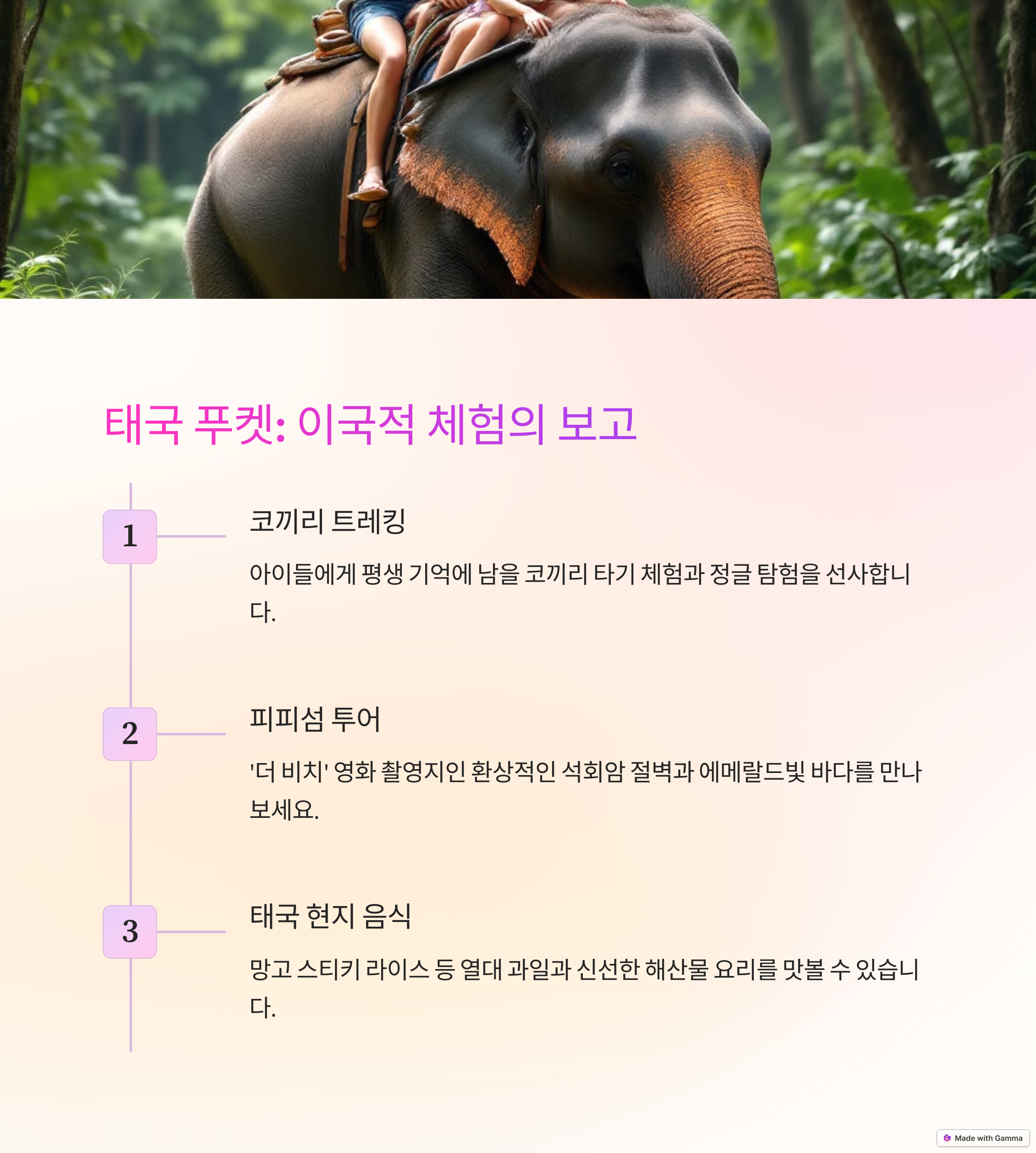 대표적인 가족 여행 액티비티로는 코끼리 트레킹과 정글 탐험이 있어요. 아이들에게도 특별한 경험이 될 거예요. 또한, 피피 섬 투어를 통해 에메랄드빛 바다를 만끽할 수도 있죠. 저렴한 물가 덕분에 맛있는 태국 음식을 마음껏 즐길 수도 있어요!