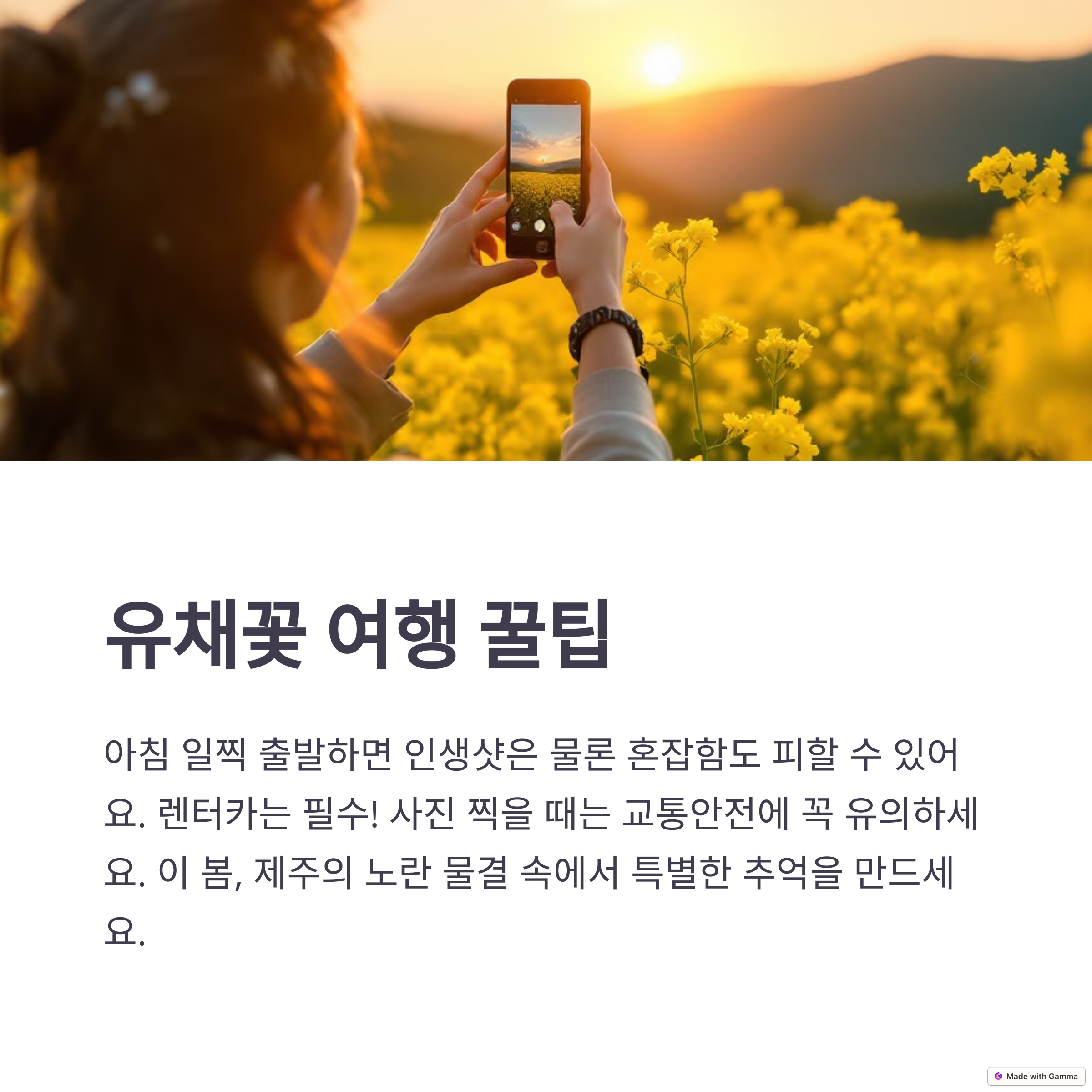 제주도의 봄은 유채꽃 없이는 설명할 수 없죠. 저도 처음 제주에 갔을 때, 바람에 살랑이는 노란 꽃들 사이에서 마음이 몽글몽글해졌던 기억이 나요. 이번 글이 여러분의 봄 여행 계획에 도움이 되었으면 좋겠어요. 혹시 이 글 보고 제주 유채꽃 명소 다녀오셨다면, 어떤 풍경이 가장 기억에 남았는지 댓글로 공유해 주세요. 같이 봄을 나누는 기분, 좋잖아요?