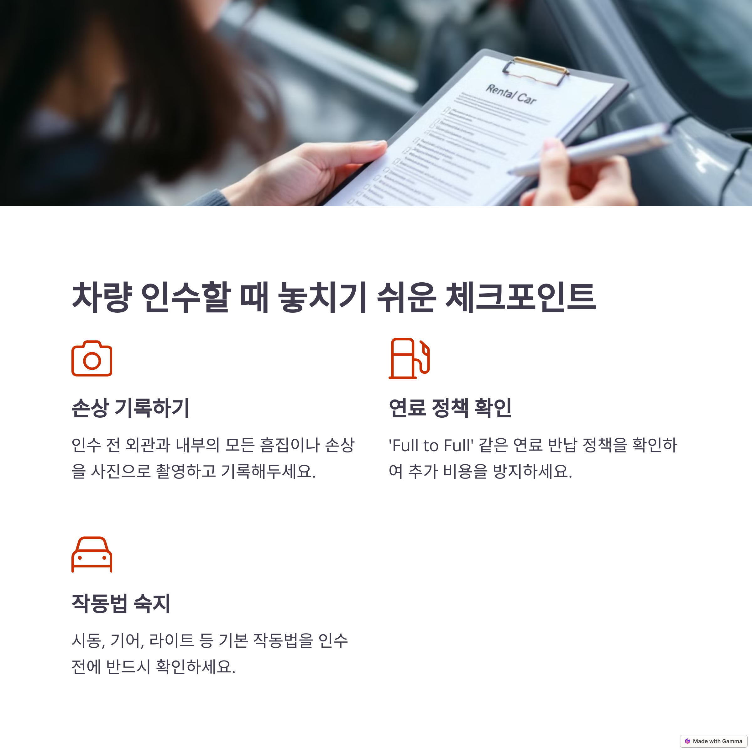 렌터카를 인수할 때는 몇 가지 필수 사항을 꼼꼼히 확인해야 합니다. 작은 실수 하나가 큰 불편을 초래할 수 있으므로 신중하게 점검하세요.