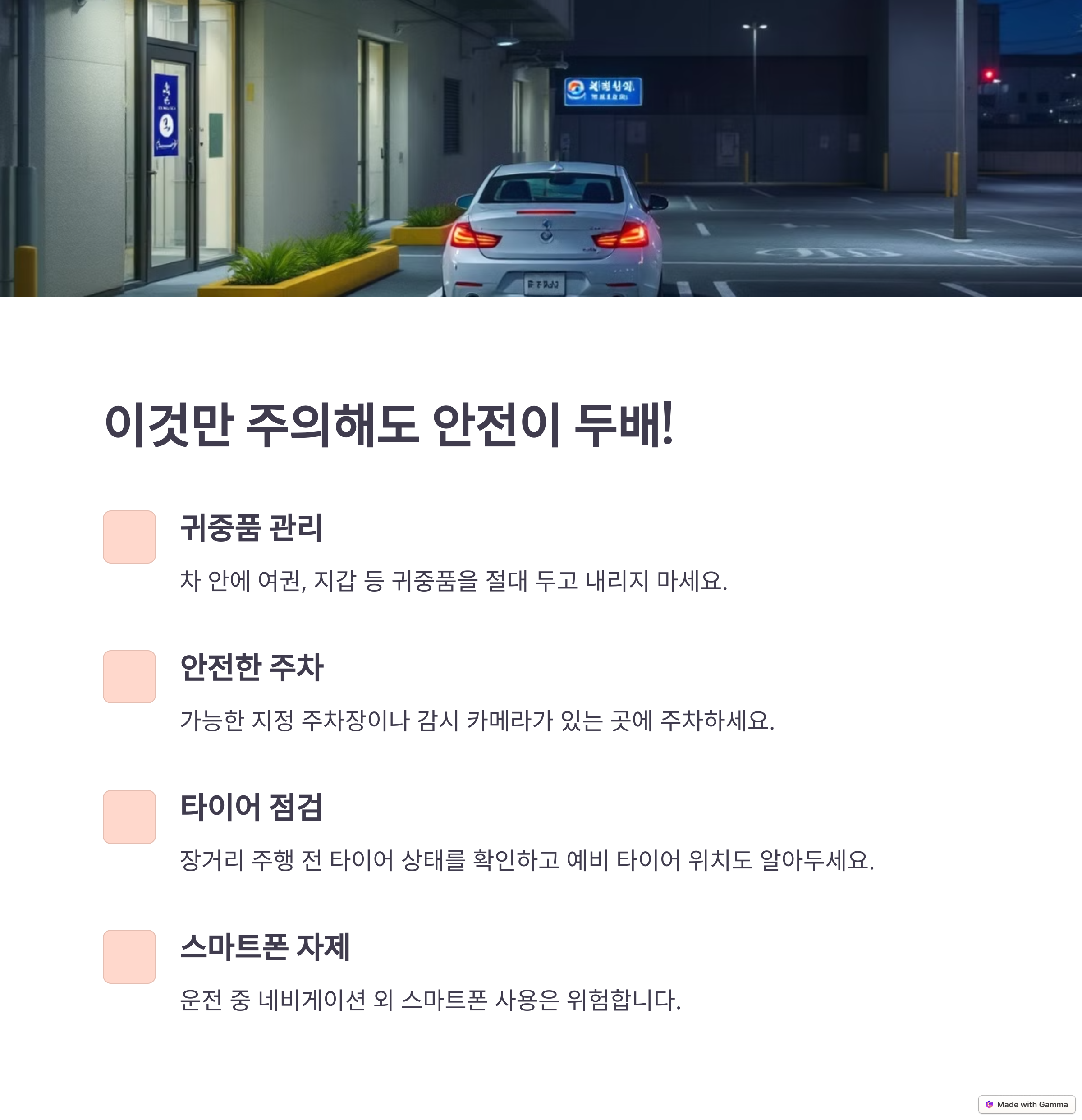 - 귀중품 보관 주의: 차량 내부에 귀중품을 두지 마세요. 특히 관광지에서는 차량 내 도난 사고가 자주 발생합니다.