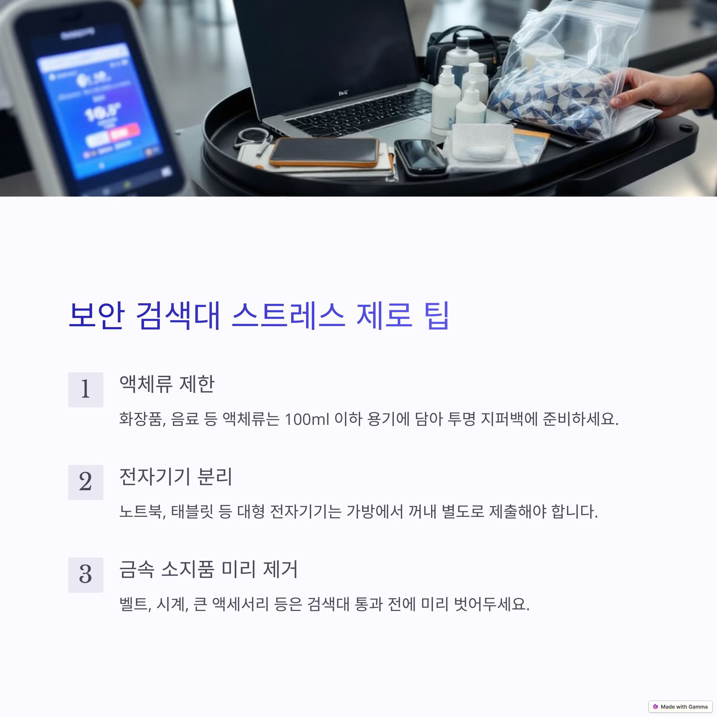 보안 검색대를 빠르게 통과하려면 금속 물품(시계, 벨트, 핸드폰 등)을 미리 빼두는 게 좋아요. 인천국제공항의 경우 CT(Computed Tomography) 스캐너가 도입되어 일부 검색대에선 액체류나 노트북을 가방에서 꺼낼 필요가 없습니다. 다만, 금속성 물품은 모두 별도 트레이에 올려야 해요. 또한, 간혹 신발을 벗어야 하는 경우가 있으니, 간편한 신발을 신는 게 좋아요.