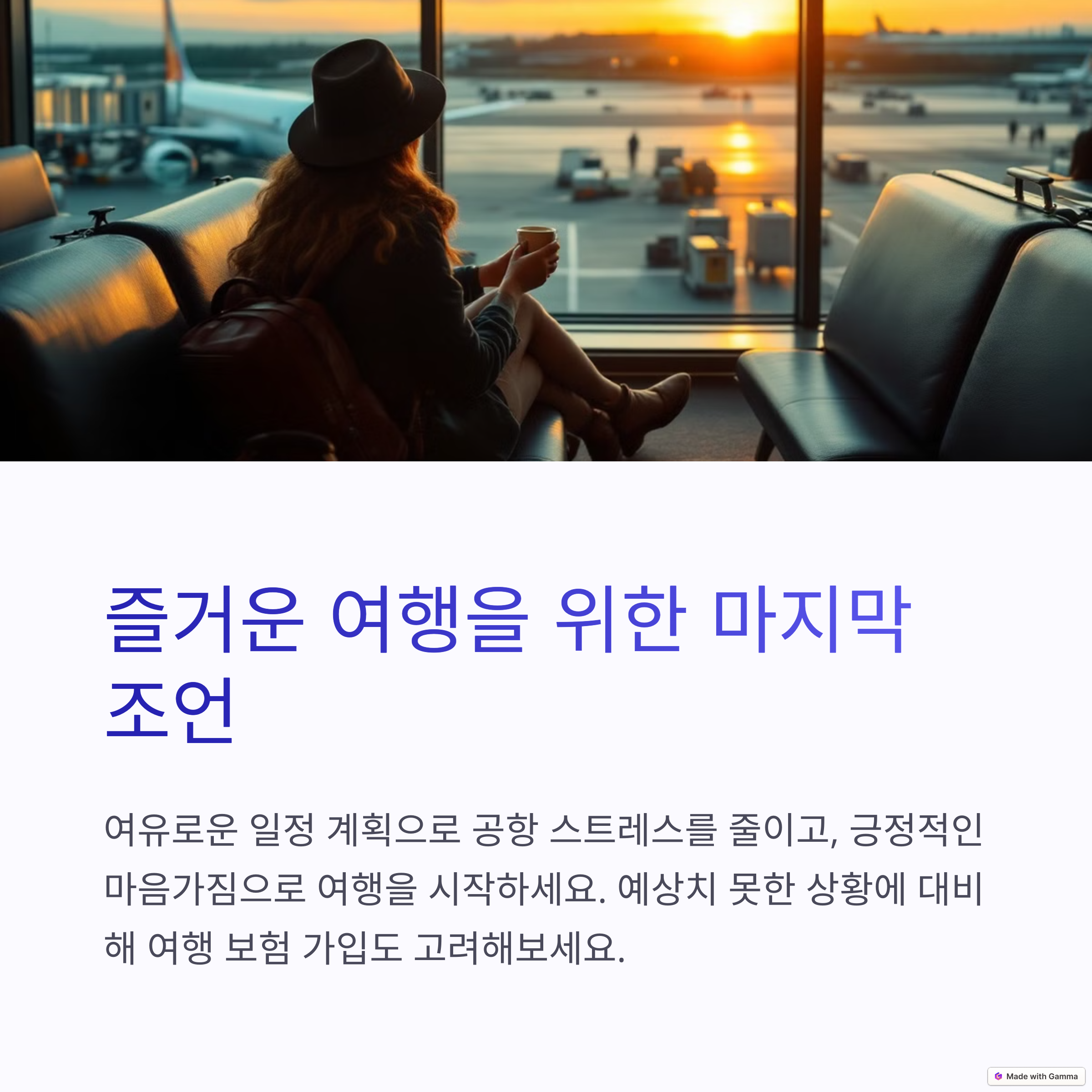 공항 이용의 핵심은 바로 시간의 여유입니다. 공항은 예상보다 훨씬 넓고 복잡할 수 있습니다. 또한, 휴대폰 배터리가 다 되지 않도록 보조 배터리도 꼭 챙기세요. 무엇보다 긍정적인 마음가짐으로 여행의 시작부터 끝까지 설레는 마음을 유지하면, 공항에서의 기다림조차 즐거운 여행의 일부가 될 것입니다.