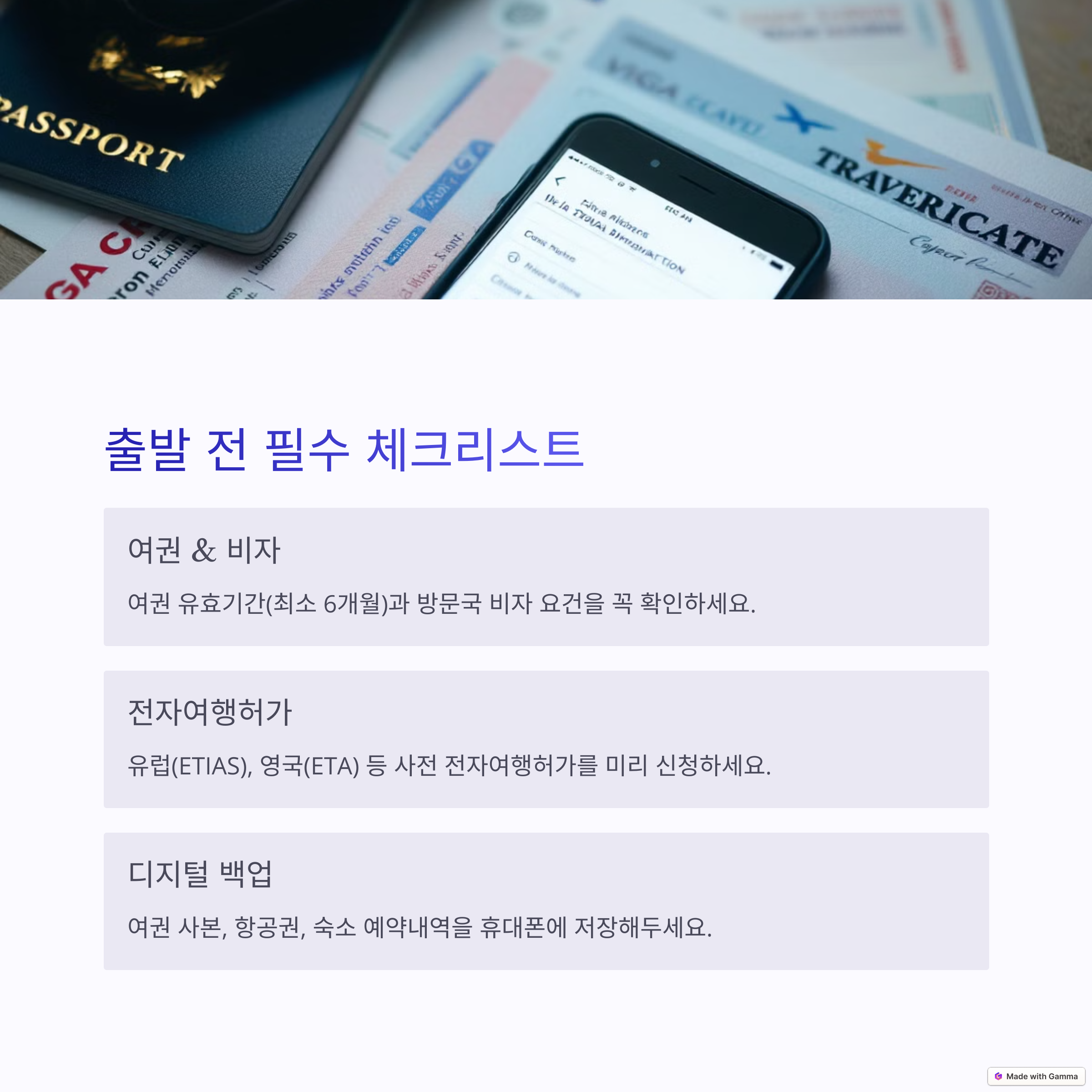 2025년 해외여행 시 반드시 체크해야 할 준비물이 몇 가지 있어요. 가장 중요한 건 여권, 비자 또는 전자여행허가예요. 유럽 여행을 계획 중이라면 ETIAS(유럽 여행 정보 승인 시스템)를 미리 신청해야 합니다. ETIAS 신청 비용은 약 7유로(약 1만원)이고, 온라인으로 간단히 처리할 수 있습니다. 영국의 경우도 마찬가지로 ETA를 필수로 준비해야 해요. 영국 ETA의 경우 비용은 약 13달러(한화 약 1만 7천 원)이고 역시 온라인 신청이 가능해요. 승인된 허가는 보통 이메일로 오기 때문에 휴대폰에 전자 사본을 저장해 두면 좋아요.
