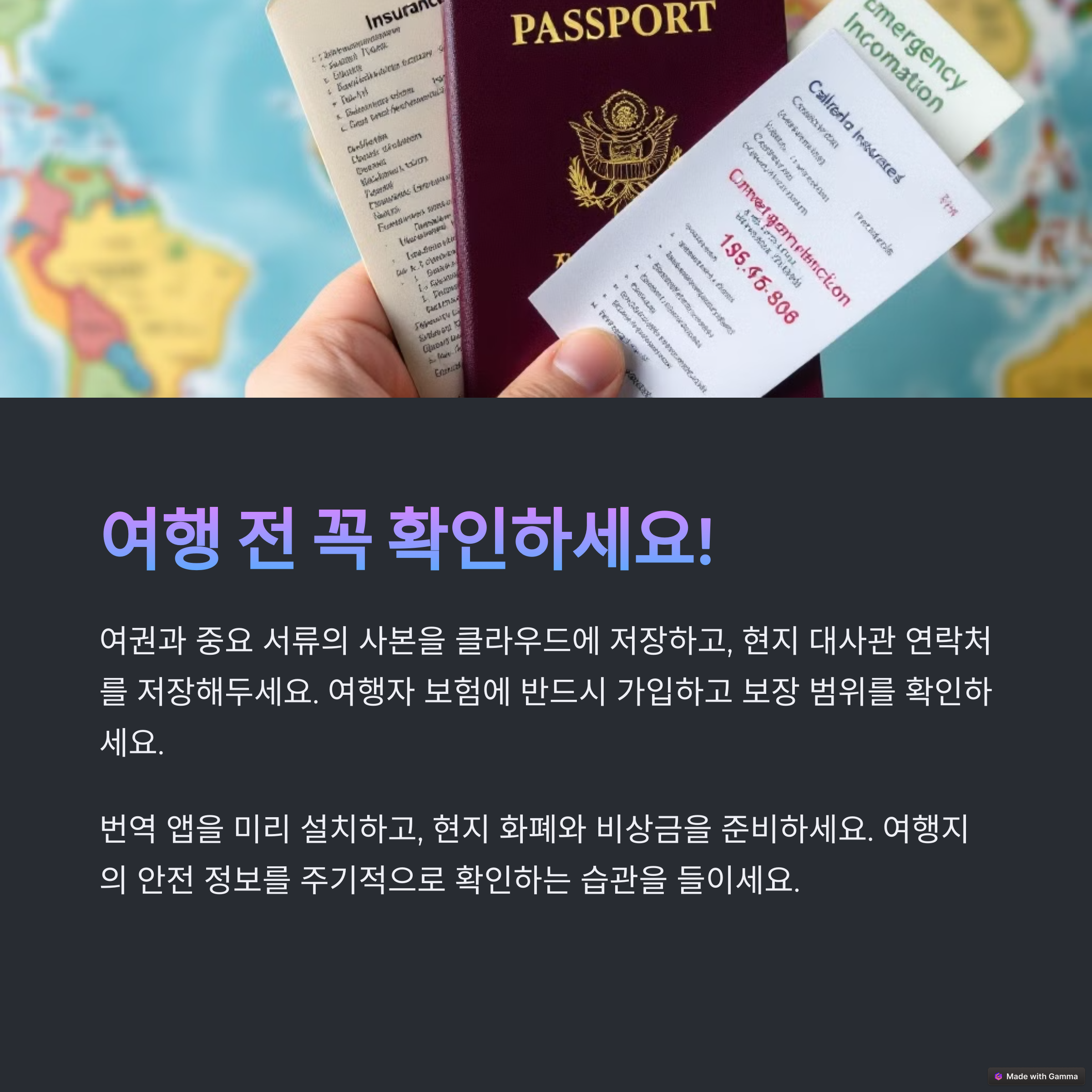 해외여행은 삶의 새로운 경험과 소중한 추억을 선물해 줍니다. 하지만 한순간의 방심이 예상치 못한 위기로 이어질 수 있죠. 여권 사본 준비, 여행 보험 가입, 긴급 연락처 저장 등 기본적인 대비만 잘해도 대부분의 문제를 미리 예방할 수 있습니다. 혹시라도 위기 상황이 발생하더라도 당황하지 않고 차근차근 해결 방법을 따라간다면 충분히 극복할 수 있습니다. 여러분의 여행이 안전하고 즐거운 순간들로 가득하길 바랍니다! ✈️🌏 혹시 더 궁금한 점이 있다면 댓글로 남겨 주세요. 함께 이야기 나눠요! 😊