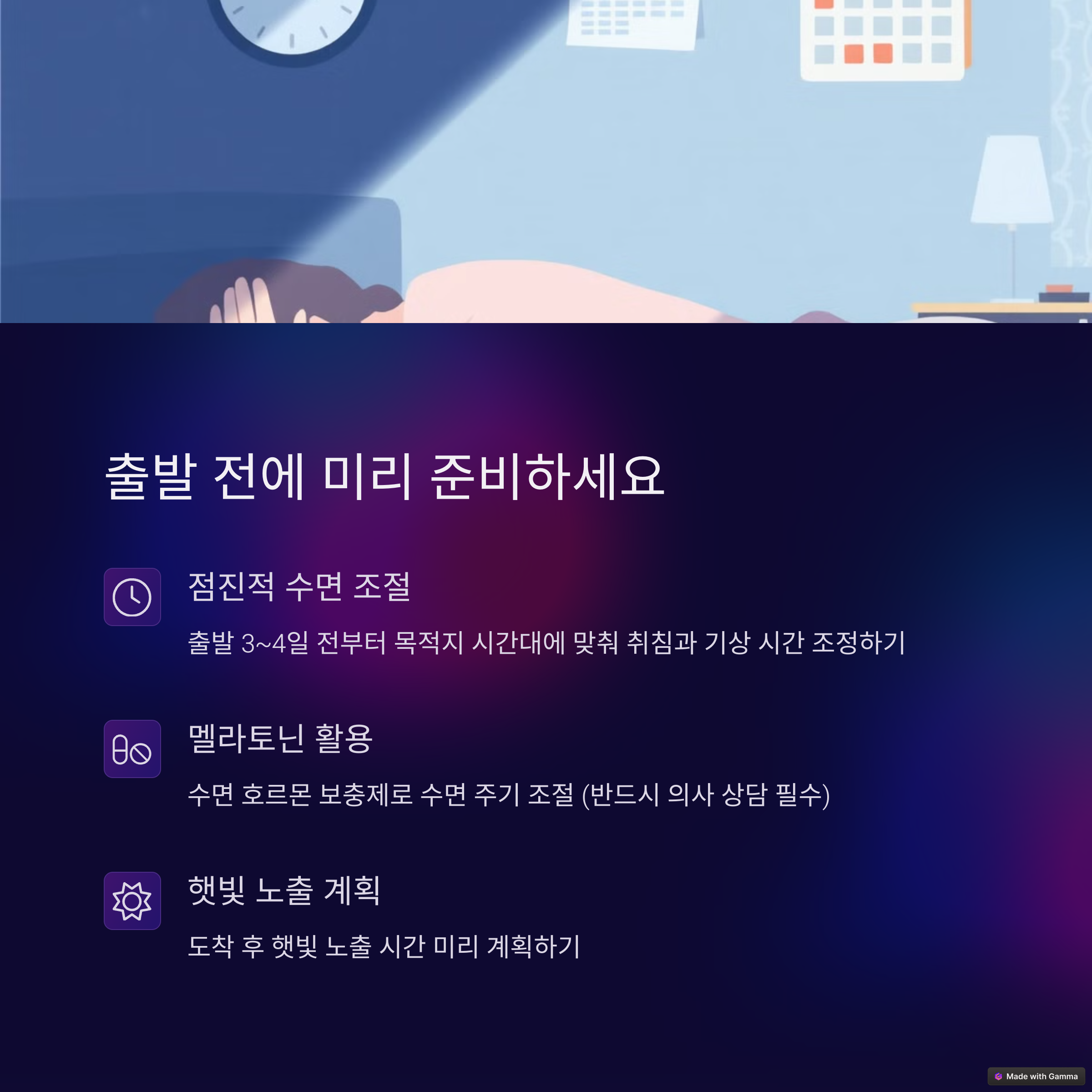 - 2. 시차가 심한 여행지는 경유지 활용하기: 12시간 이상 시차가 나는 목적지로 갈 때는 중간에 하루 정도 경유지에서 쉬어가는 것도 좋은 방법입니다.