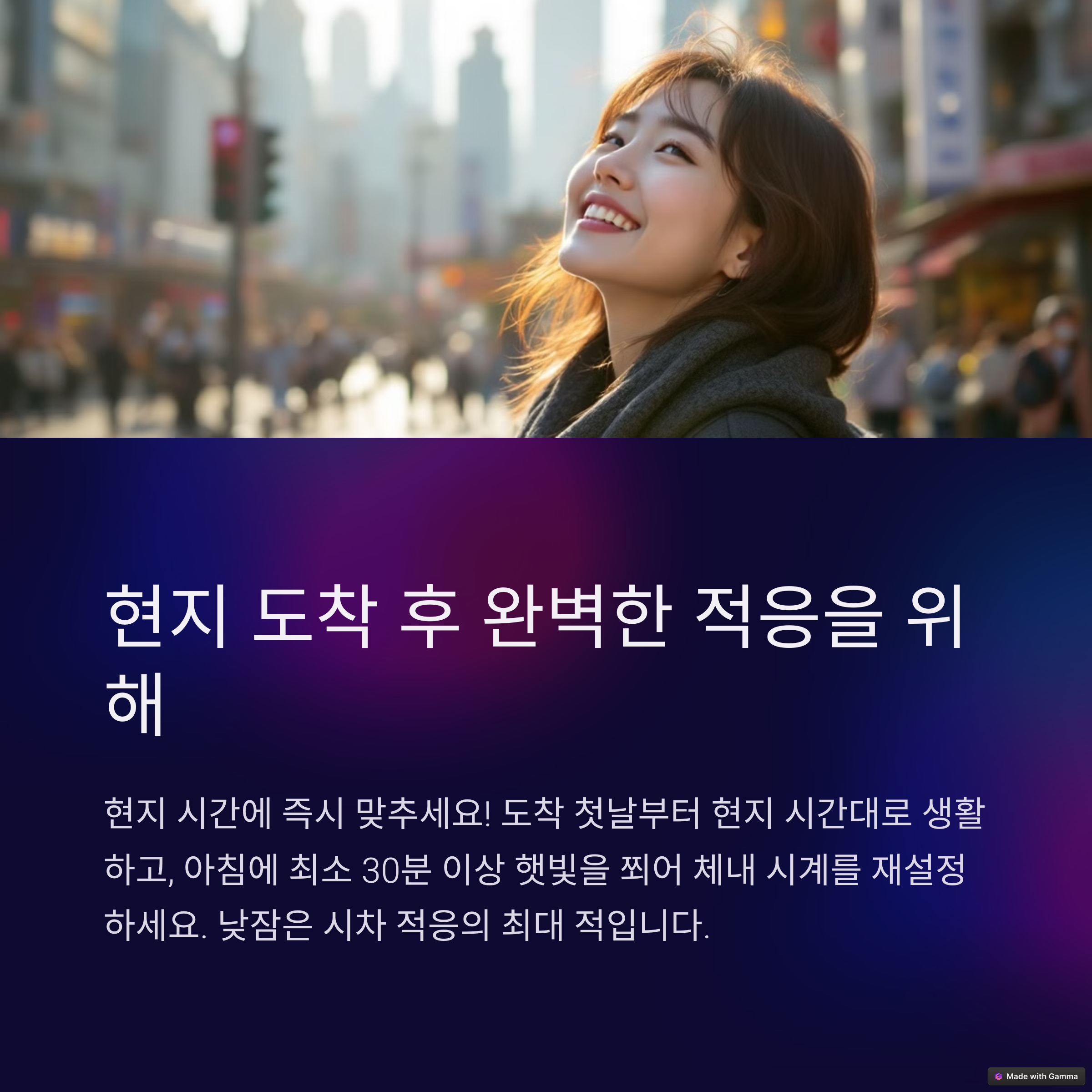 - 3. 개인차를 인정하기: 나이, 평소 수면 패턴, 신체 컨디션에 따라 시차적응 속도는 천차만별입니다. 20대 때는 1-2일이면 적응됐는데, 40대가 되니 3-4일이 필요하더라고요. 무리하게 일정을 잡지 말고 자신의 적응 속도를 존중해 주세요.