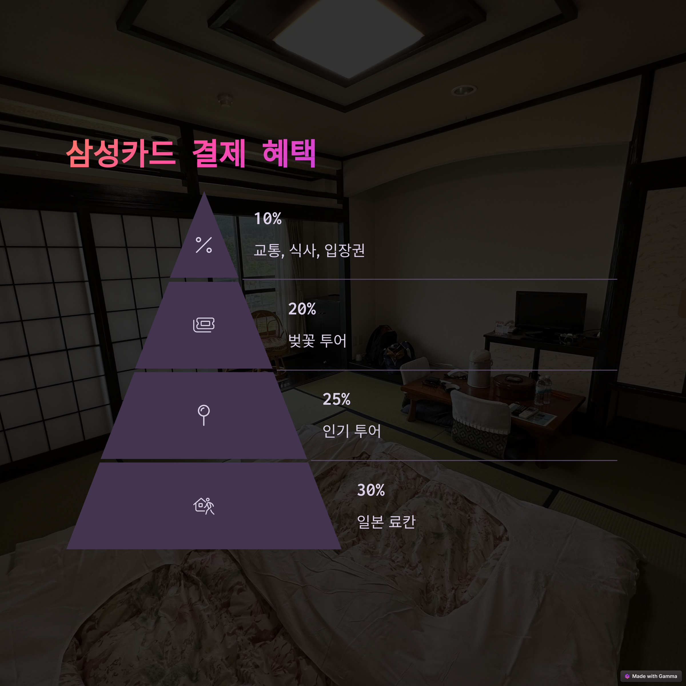 삼성카드를 사용하면 이렇게 다양한 항목에서 혜택을 받을 수 있어요. 특히 일본 료칸은 가격이 꽤 나가는 편이라 30% 할인이면 꽤 큰 절약이 되겠죠?