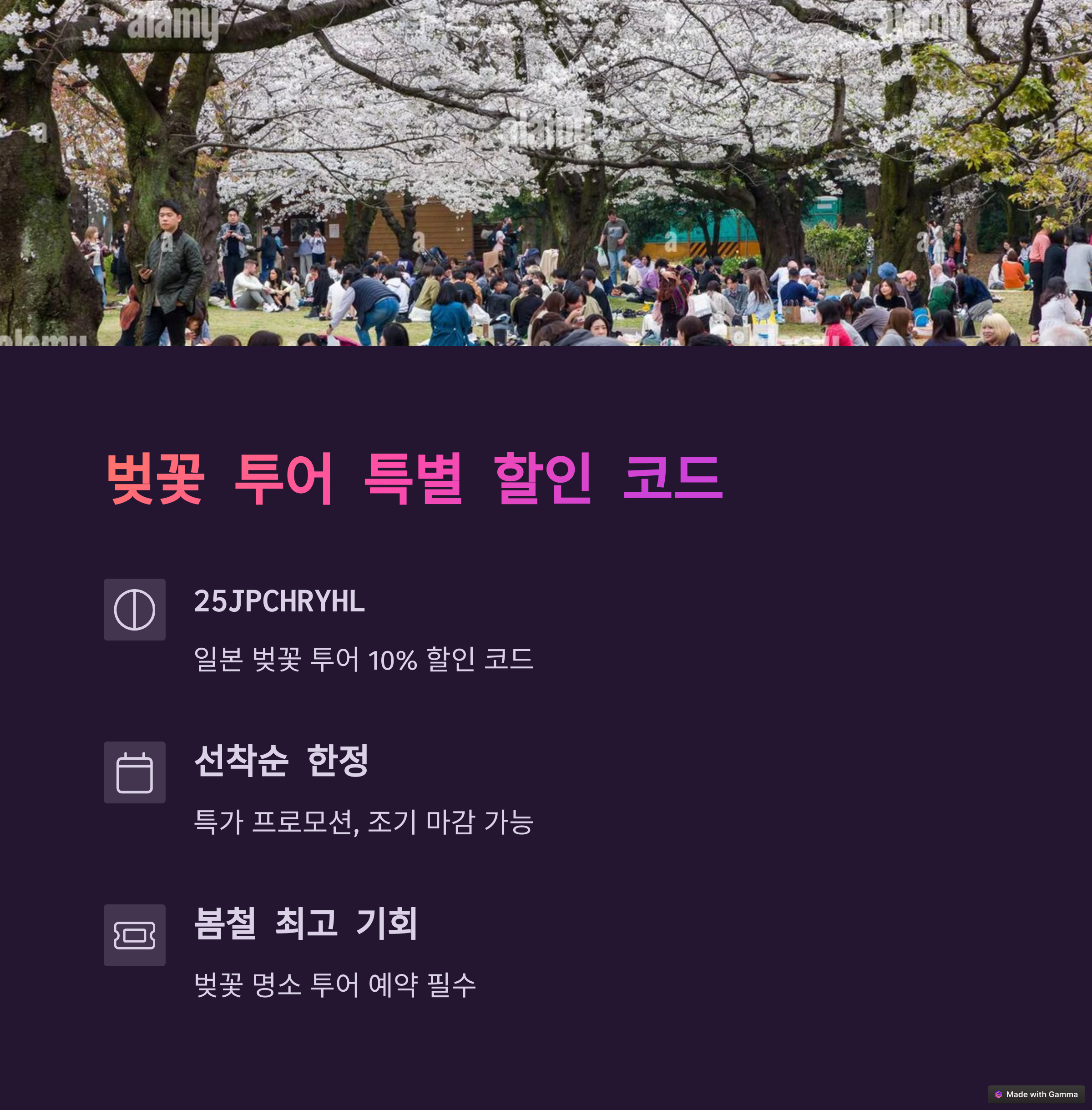 | 25JPCHRYHL 벚꽃 투어 할인코드 | 2025년 3월 31일까지 |